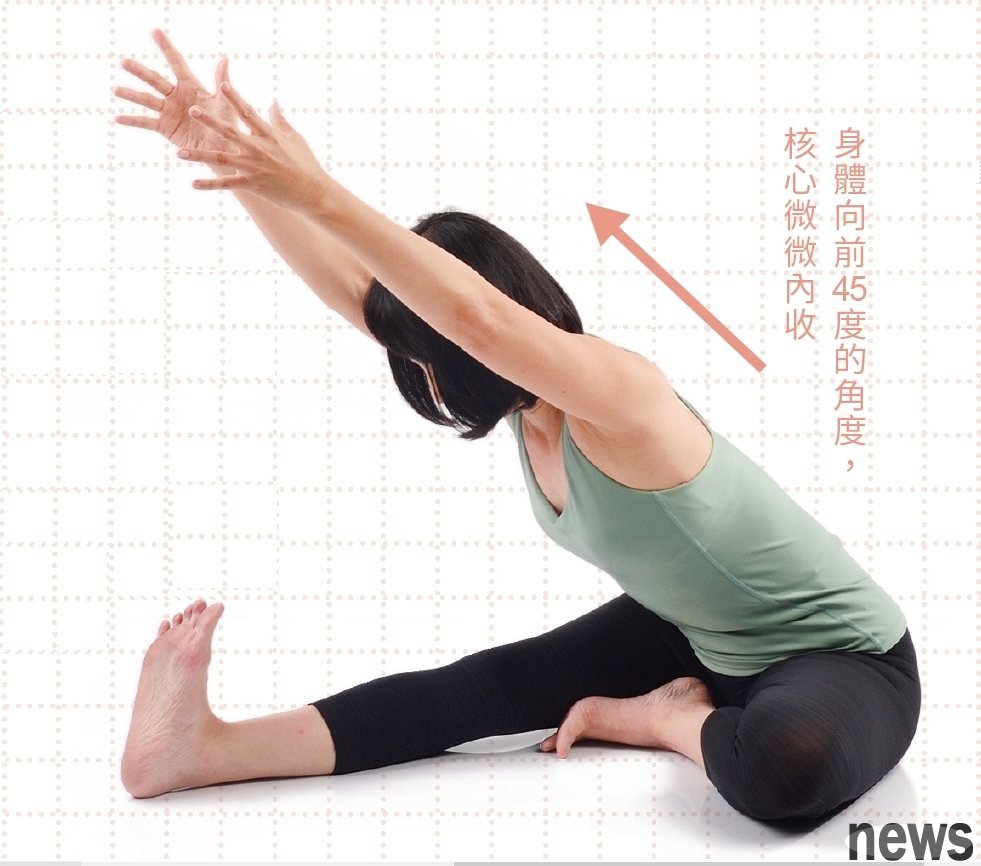 5. The body moves forward to an angle of 45 degrees, keeps forward, the core slightly retracts, and the vertebrae extends as much as possible.