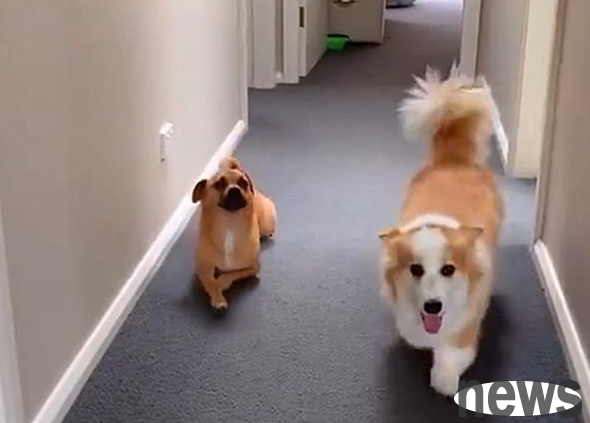 When Corgi walked around the corner, he finally found the dog learning to walk behind him, so Corgi barked at the dog, as if to say: Who are you, get up!