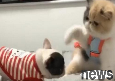 Comments from netizens: What a pitiful little French Dou. They are both so cute. Over time, they have become best friends. The same goes for our cat and dog. The first time we saw him, we beat him so much that the cat jumped on the cabinet and was afraid to come out. Now we play together every day.