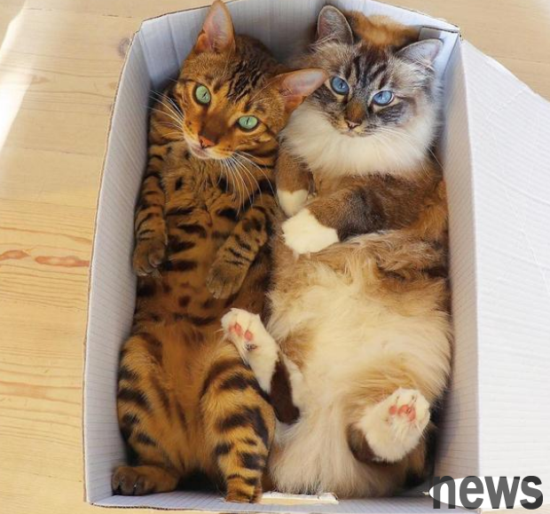 Three-year-old Bengal cat Jill and four-year-old ragdoll cat Nelly live happily together with their poop scraper. Although Jill and Nelly are different in gender, they are as close as siblings.