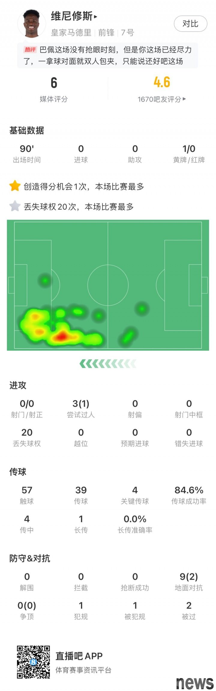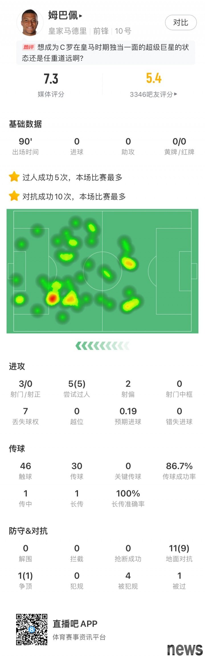 Mbappe had 3 shots on goal, 0 key passes, and 10 successful confrontations, the highest number in the game; Vinicius had 0 shots, 4 key passes, and only 2 successful attempts in 9 confrontations. Neither man managed to find the back of the net at Anfield.