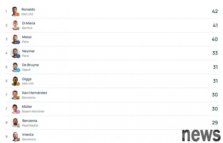 Top 10 assists in the Champions League (data from the official website of the Champions League)