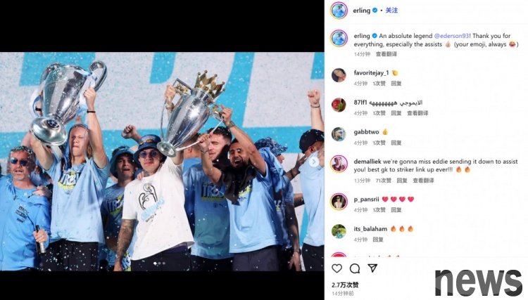 Haaland posted a photo of him celebrating his triple-champion season with Ederson, and wrote: "Absolute legend @Ederson! Thank you for everything, especially your assists 👍🏻 (your emoji, always so😂)"