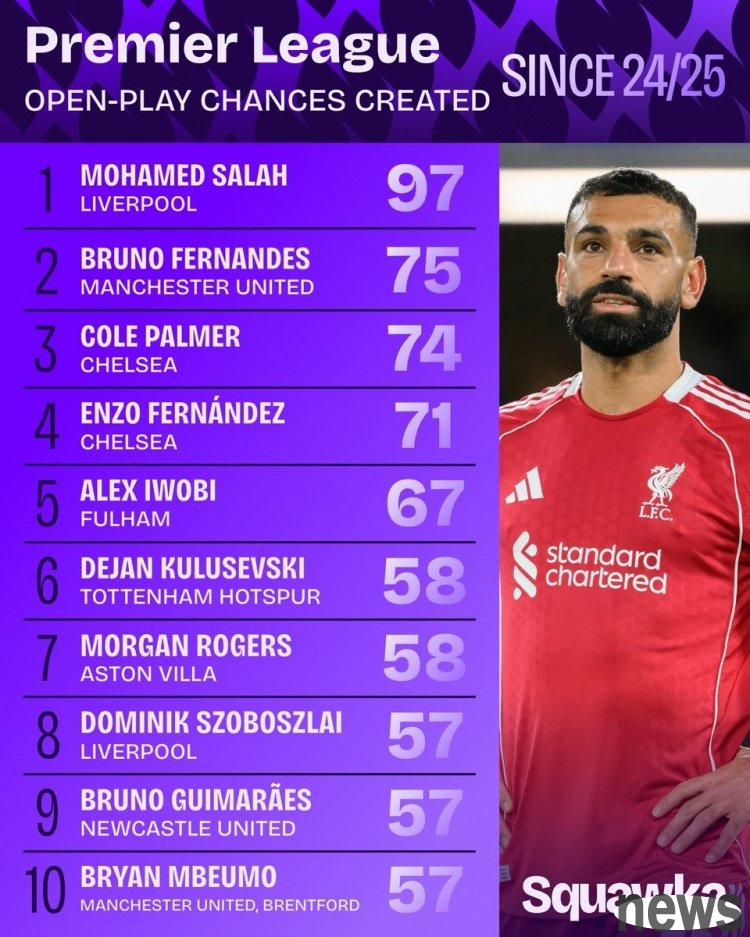 A few days ago, Squawka counted the number of opportunities created in Premier League sports battles since the 24/25 season. Salah ranked first, followed by B Fee and Palmer.