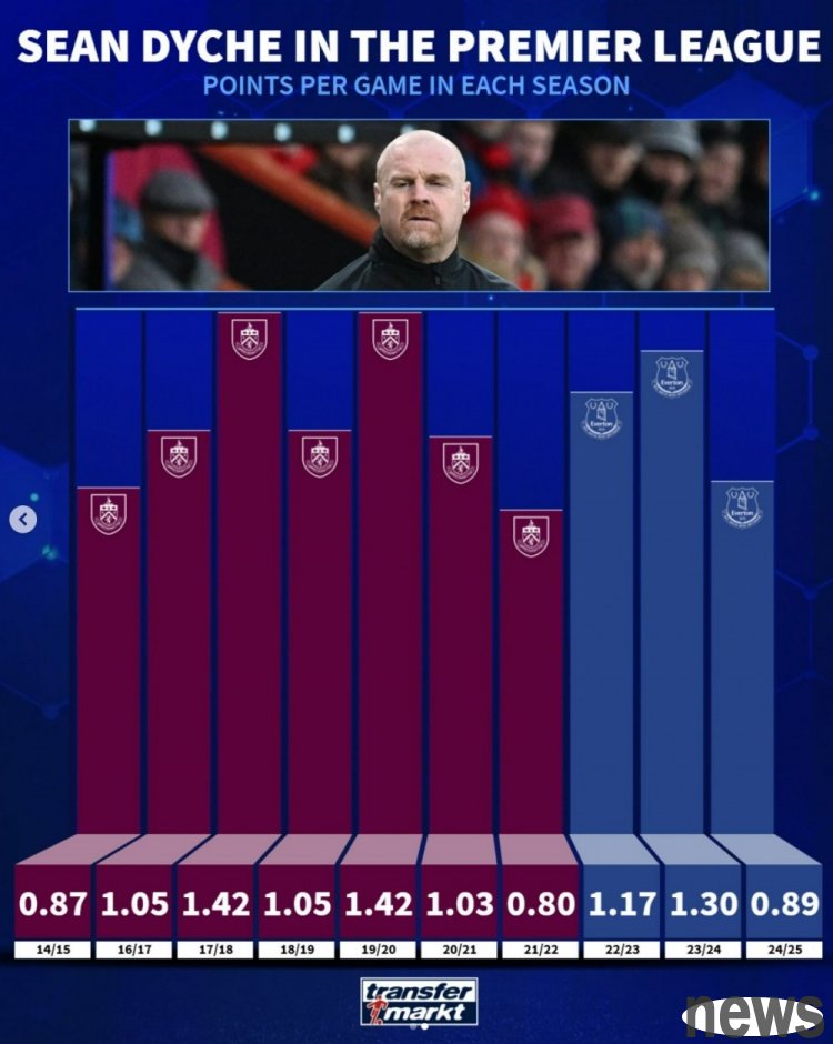 Ditch officially coached Nottingham Forest. Dezhuan also took stock of Dyche's points per game in the Premier League seasons when he coached Burnley and Everton. The details are as follows:
