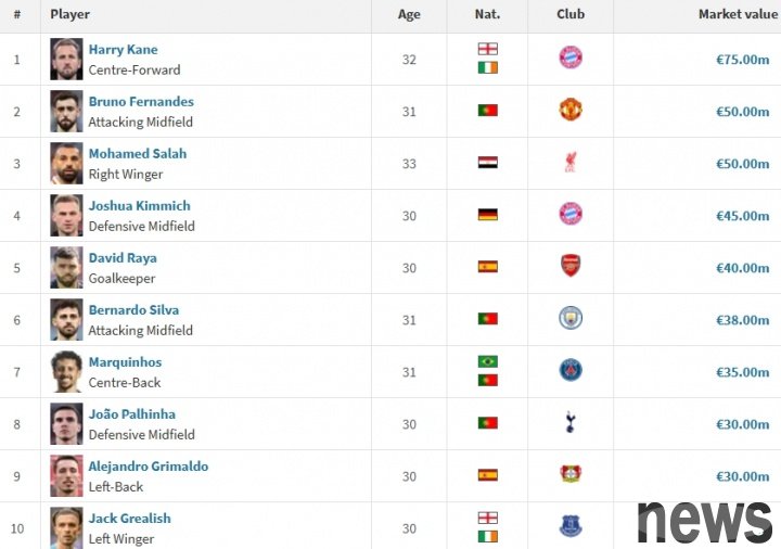Yesterday, Germany updated the value of Bundesliga players. The value of 32-year-old Kane has not changed and is still 75 million euros. Although his net worth has not increased, Kane still leads the ranking of current players over the age of 30.