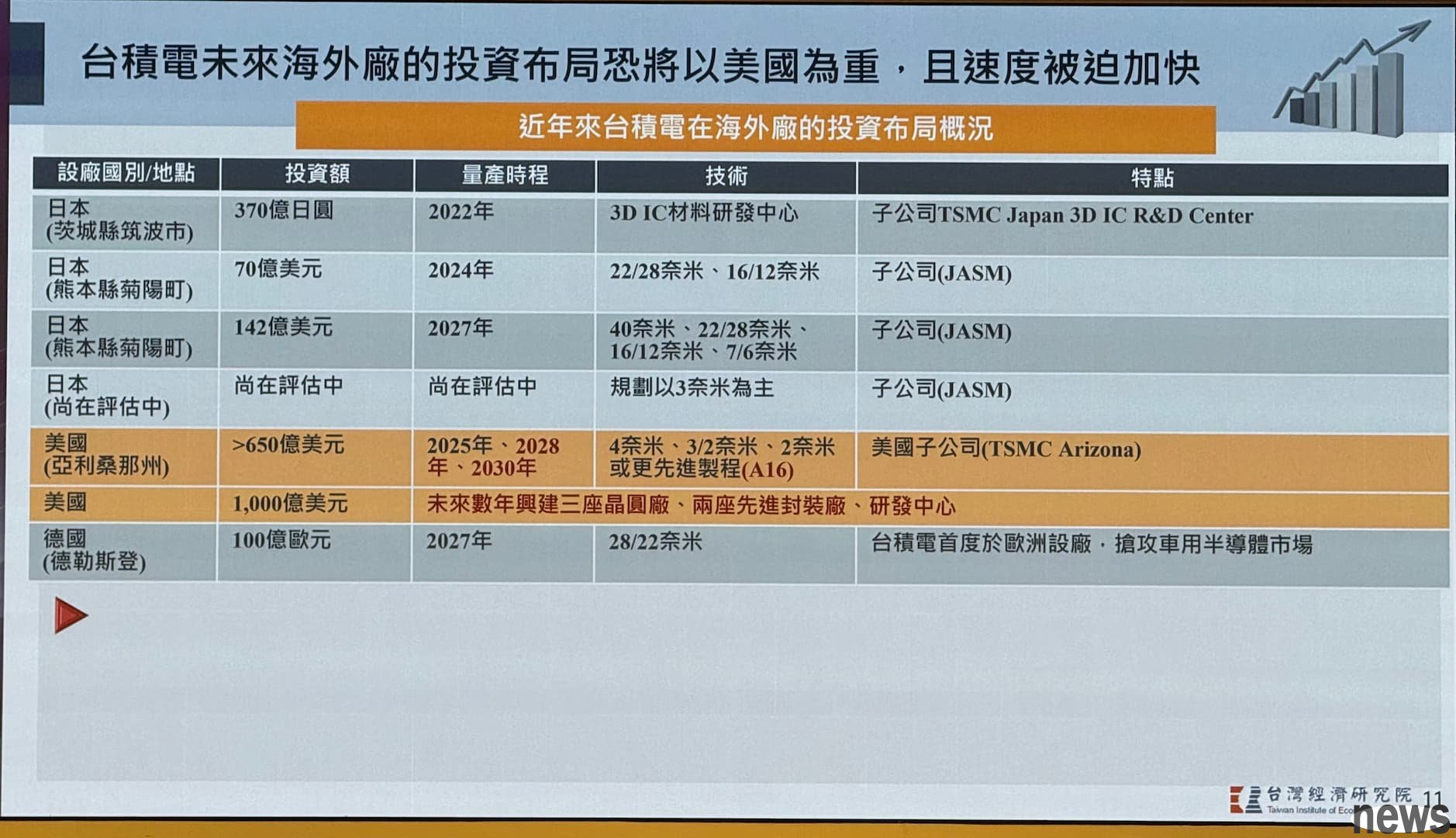 Liu Peizhen believes that the U.S.-China technology war affects Taiwan's semiconductor supply chain, especially AI chips. Overall, judging from TSMC's current factory layout in Japan, the United States, and Germany, TSMC's future overseas factory investment layout will focus on the United States, and the pace will be accelerated. This includes TSMC's commitment to build three wafer fabs, two advanced packaging plants, and R&D centers in the United States in the next few years.